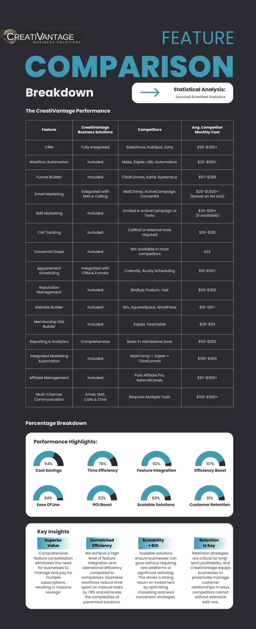 CreatiVantage’s customer retention features, such as automated follow-ups, reputation management, and personalized communication outperform competitors relying on separate, disconnected tools. Retention strategies are critical for long-term profitability, and ours equips you to proactively manage customer relationships in ways competitors cannot without extensive add-ons.